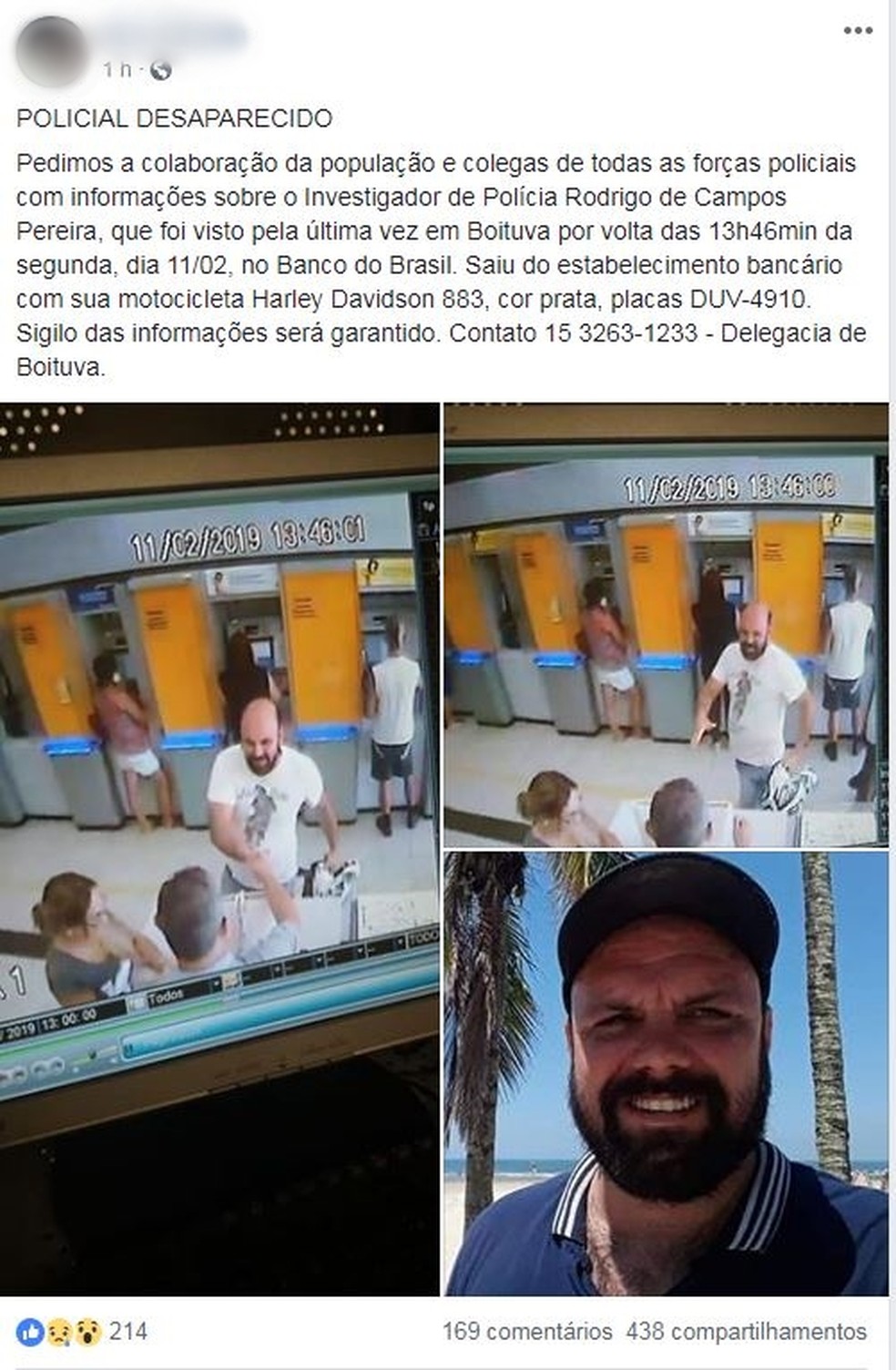 Imagens da agência bancária que circulam nas redes sociais mostram o investigador na agência bancária por volta das 13h46 do dia 11. Essa foi a última imagem registrada do investigador obtida pela polícia.