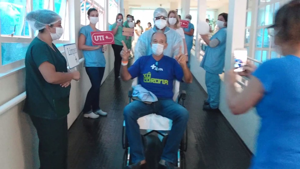 Os funcionários ficam perfilados em corredores e aplaudindo o paciente. Eles também estão segurando cartazes. A homenagem foi feita no sábado (11). Benevenuto, que é morador de Rio Preto, deu entrada na unidade hospitalar em 19 de março. Ele apresentava síndrome gripal e insuficiência respiratória.