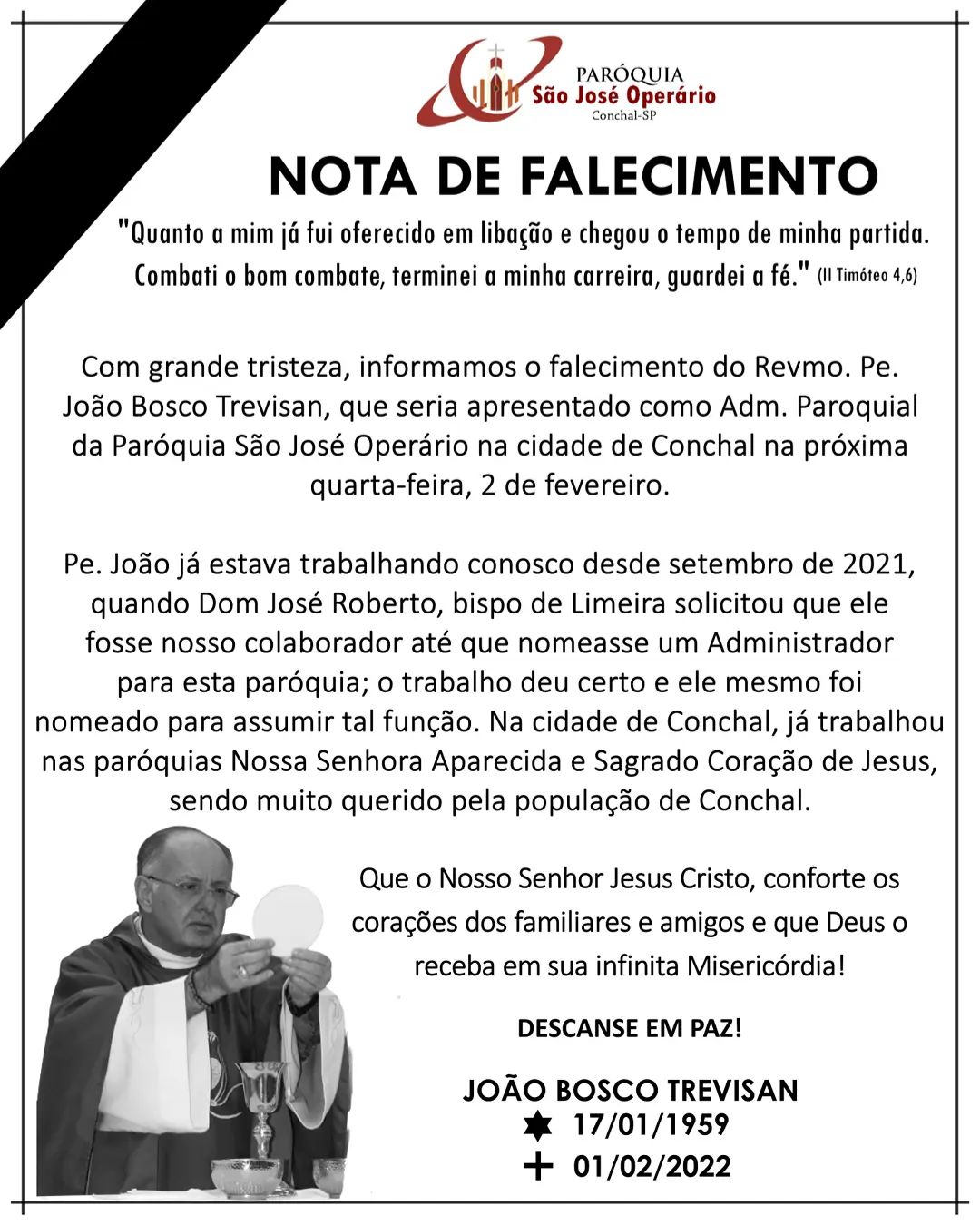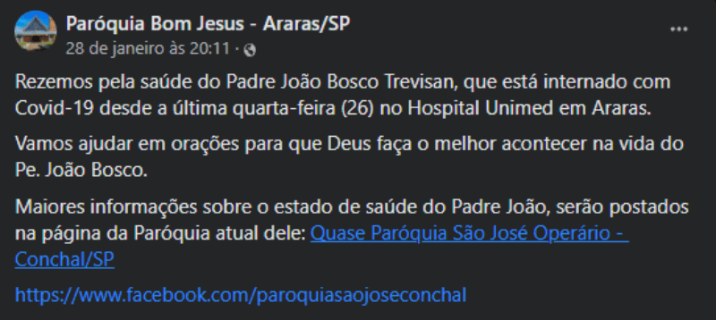 Morreu na madrugada desta terça-feira (1º), o querido Padre João Bosco Trevisan, aos 62 anos em decorrência da Covid-19. Ele estava internado desde a última quarta-feira (26) no Hospital Unimed em Araras (SP), de acordo com publicação da Paróquia Bom Jesus. Veja abaixo: