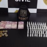 Os dois indivíduos com várias passagens foram abordados, sendo localizados com os mesmos 37 pedras de crack, 60 eppendorfs de cocaína mais a quantia...