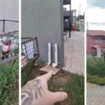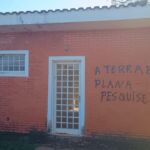 Desta vez o alvo foi o postinho de saúde do Assentamento Rural III, localizado na zona leste, com os dizeres “A terra é plana,...