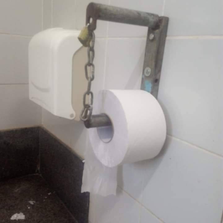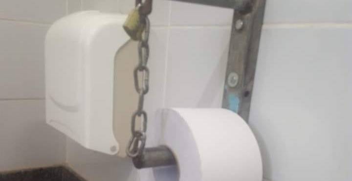 Por conta da falta de educação e respeito ao próximo de algumas pessoas, foi necessário prender o rolo de papel higiênico em suporte com cadeado e corrente, no banheiro que fica na entrada do Lago Municipal. “Um absurdo, mais é a realidade do nossa cidade. Até rolo de papel higiênico estão levando embora”, disse Osmar Guerra.