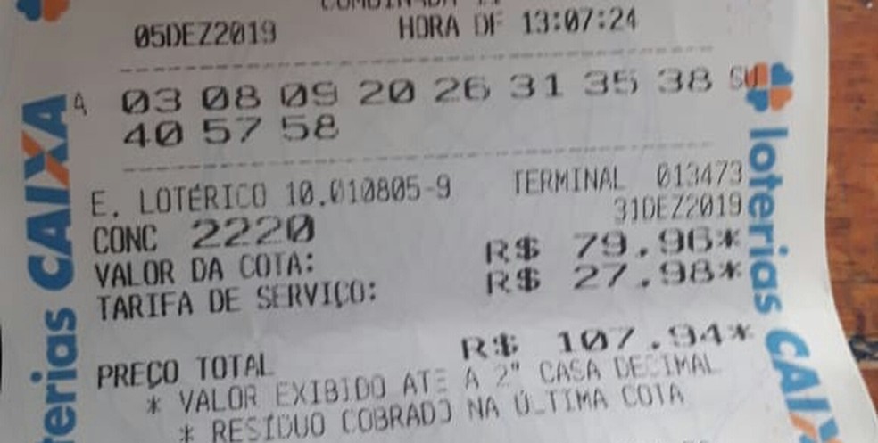 Logo depois do sorteio, que aconteceu na noite dessa terça-feira (31), Jaqueline disse que ligou para o idoso avisando sobre o prêmio. O pecuarista pagou R$ 107,94 pelo bilhete e, assim como os outros apostadores do bolão, ele deve receber um prêmio de cerca de R$ 2,9 milhões pela cota comprada.