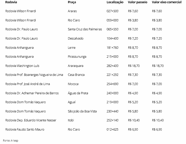 Onze praças da ViaPaulista, localizadas na região de São Carlos, não tiveram alterações nos valores neste momento, pois os prazos contratuais são diferentes das demais concessionárias. As cinco praças da concessionária Eixo-SP já tiveram os valores reajustados no início do mês.
