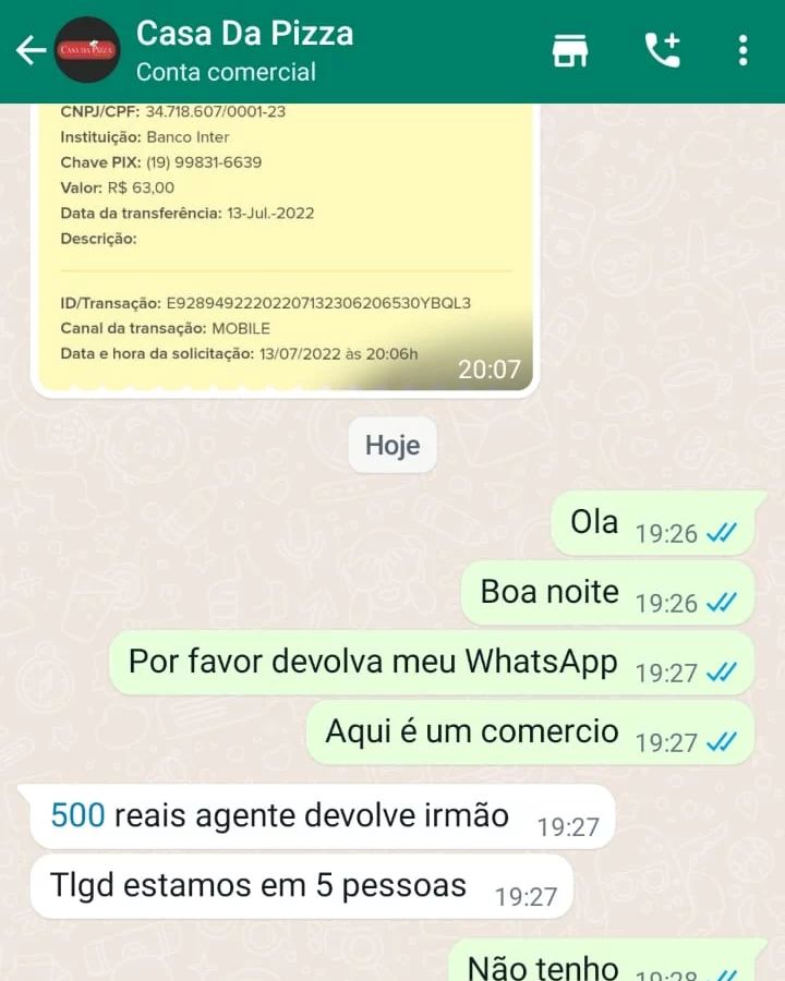 O mesmo aconteceu na cidade de Conchal (SP), onde a Casa da Pizza também teve o Whatsapp hackeado. Feito contato com os golpistas através do número da pizzaria, os criminosos exigiram R$ 500,00 para devolverem o perfil comercial. Veja abaixo: