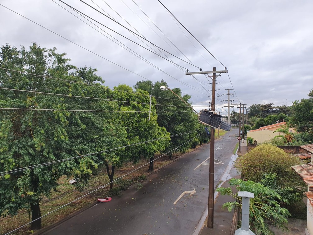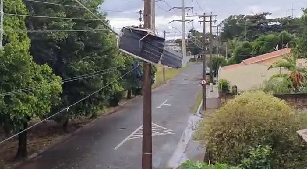 Uma placa de aquecedor solar de água ficou pendurado em um poste durante o temporal da madrugada deste domingo (7) que causou estragos Artur Nogueira (SP). Outra parte do equipamento foi parar na calçada do lado oposto ao imóvel, que fica no Centro.