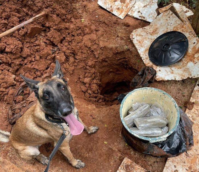 Vinte tijolos estavam enterrados no jardim da casa de um dos criminosos presos. Droga foi localizada por cão farejador.