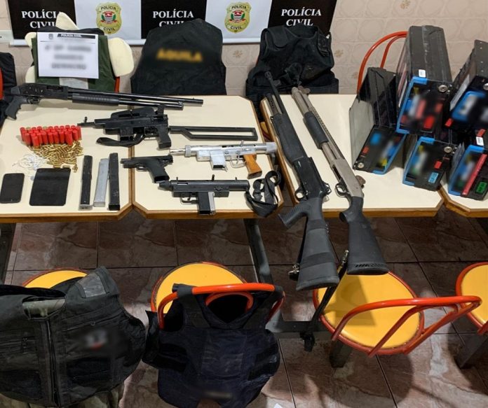 Com o trio, foram apreendidos três metralhadoras calibre 9 milímetros, três espingardas calibre 12, uma pistola calibre .40, bem como diversas munições dos respectivos calibres, cinco coletes balísticos e 11 placas para os mesmos. Também foram recolhidos cassetetes subtraídos no assalto e vestimentas usadas no crime, como touca e luva.