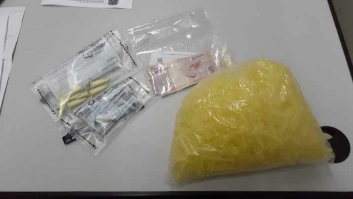 Feita abordagem, com o mesmo foram encontrados 6 pinos de cocaína e R$ 40,00 em dinheiro, já com o menor foi encontrado um pino die cocaína que ele acabara de comprar. Durante a ação que contou com apoio do sargento José e cabo Wilson, os policiais apreenderam 400 pinos vazios em uma residência.