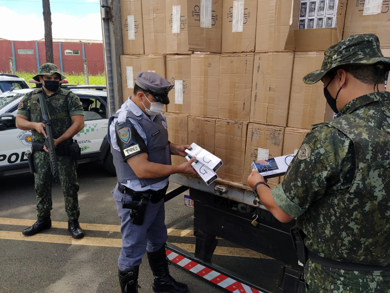 Ao perceberem a aproximação da viatura, os criminosos tentaram fugir. Contudo, três foram detidos e um correu para os fundos de uma propriedade rural. Após abordagem e vistoria no caminhão, verificou-se a carga de cigarros.