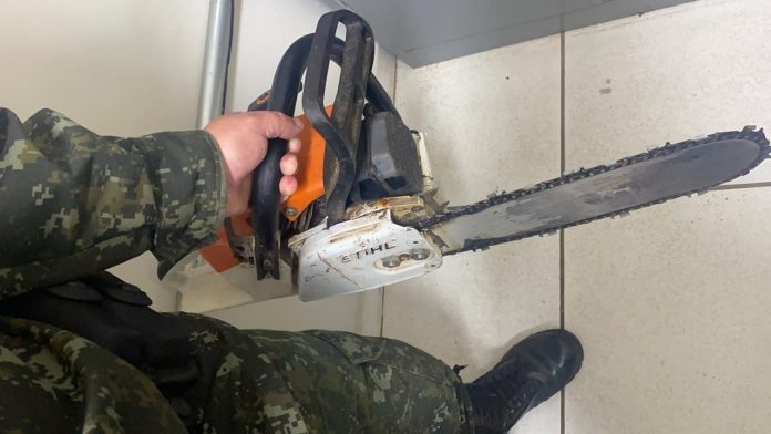 Na ocasião a equipe territorial, composta pelo cabo Sérgio e cabo Fernandes, deparou-se com o corte de árvores exóticas da espécie “eucalipto” em área comum, sendo que após fiscalização foi constatado a utilização de 01 (uma) motosserra, sem a devida Licença para Porte e Uso (LPU).