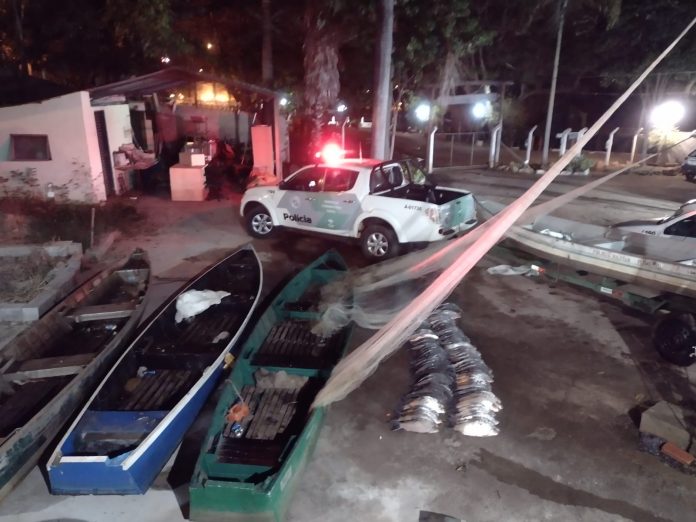 Diante de tais constatações, foi realizado pela equipe o devido cerco policial, sendo que os indivíduos embrenharam-se na mata abandonando as embarcações na margem esquerda do rio, bem como as tarrafas e o pescado capturado, não sendo obtido êxito na abordagem mesmo após sucessivas incursões.