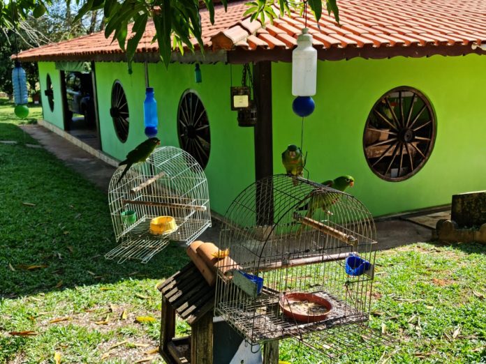 As aves estavam acondicionados em gaiolas individuais, e durante a vistoria foi constatado que as duas aves estavam com as asas cortadas, gerando com isso uma certa deficiência motora das aves, mediante este fato foi elaborado uma multa simples no valor de R$ 6.000.00 conforme o art 29 da resolução 05/21 SIMA e o art 32 da lei 9605/98.