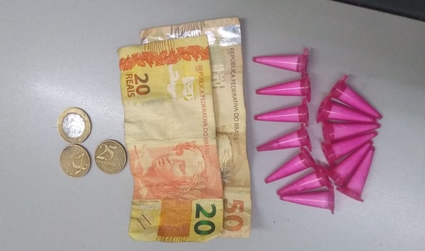 Imediatamente a equipe foi para o local, onde foram localizadas as três pessoas com as características passadas, realizado a abordagem e busca pessoal, sendo identificado os indivíduos como um maior de idade e os outros dois menores de idade, encontrado com um menor a quantia de R$ 71,50 (setenta e um reais e cinquenta centavos) no bolso de sua bermuda, e ciente do local de esconderijo, localizado no cano indicado a quantia de 13 (treze) pinos de cocaína prontos para venda e consumo.