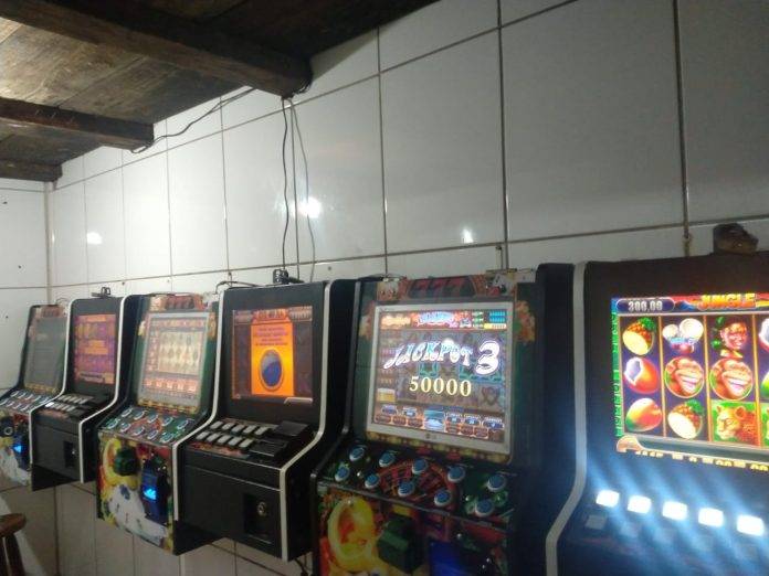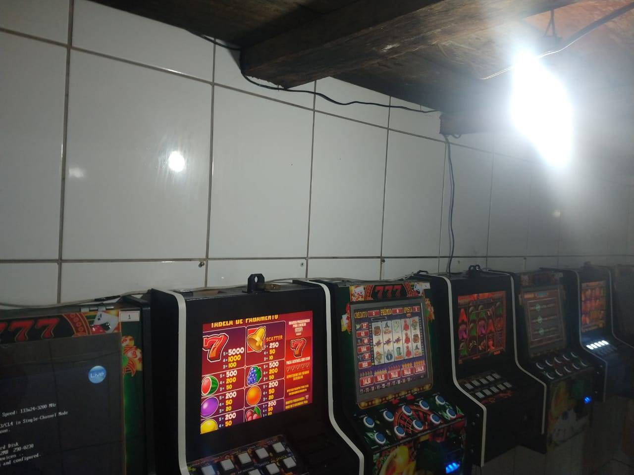 Na averiguação no local indicado foi constatado em uma padaria sete máquinas caça-níqueis, ligadas sem jogadores, posteriormente constatou se também em um bar no bairro Vila Bela Vista, mais sete máquinas caça-níqueis, sendo uma máquina desligada e seis máquinas ligadas.