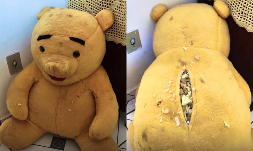 Dentro do urso foram encontradas pedras de crack, porções de cocaína, maconha e dinheiro.