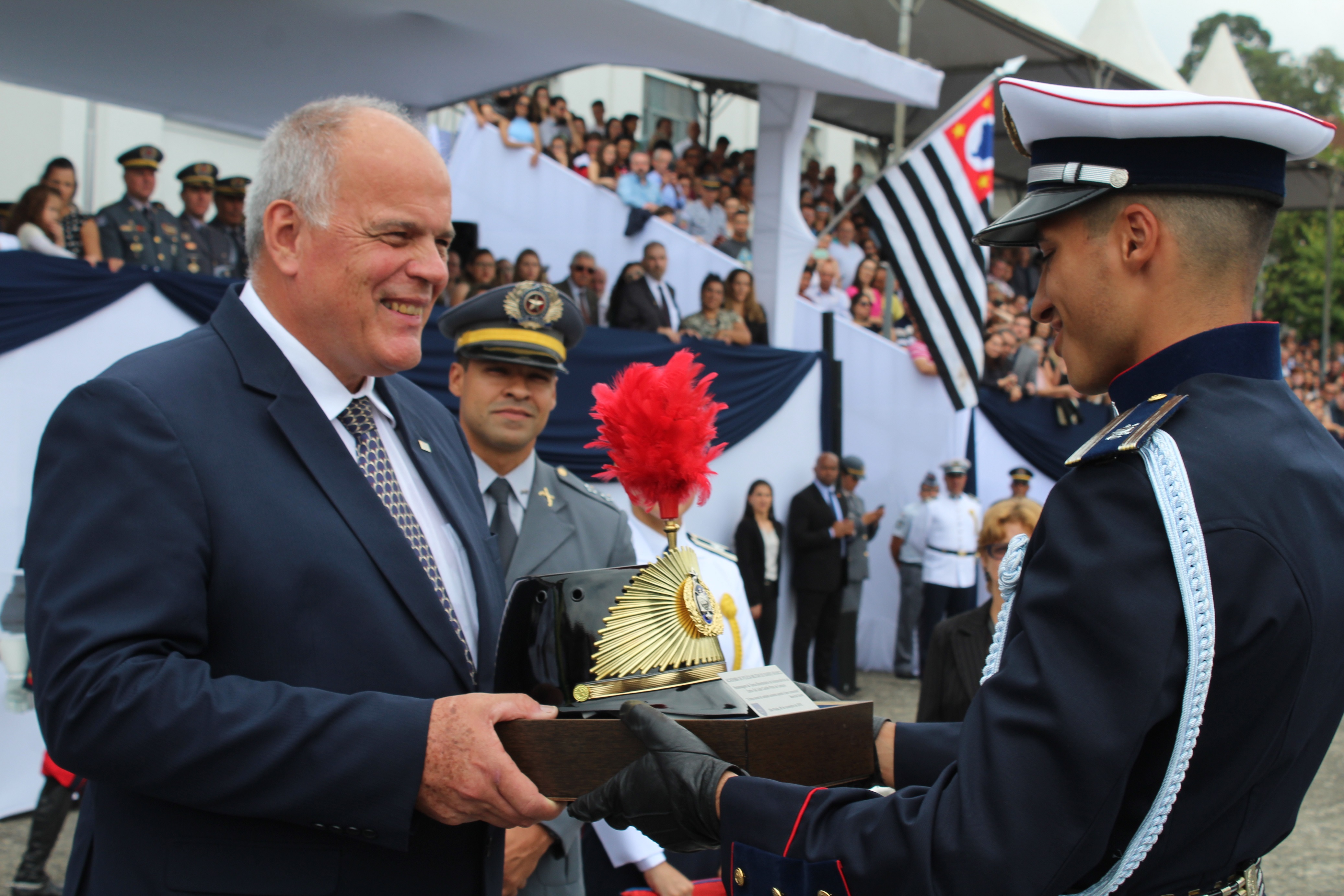 A Polícia Militar realizou, na manhã deste sábado (9), a cerimônia de entrega de espadins aos 266 novos alunos-oficiais da Academia de Polícia Militar do Barro Branco (APMBB). O secretário da Segurança Pública, general João Camilo Pires de Campos, participou da solenidade como paraninfo da turma.
