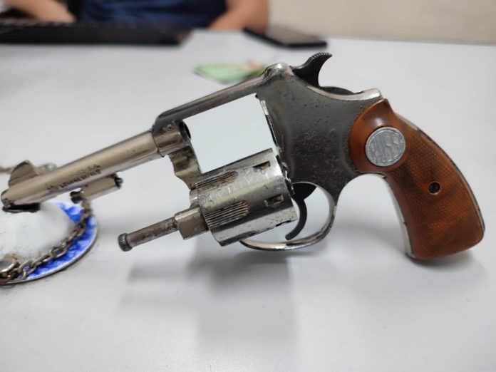 Em sua cintura, foi localizado um revólver calibre.22 sem munições, ao ser indagado a respeito da situação alegou ter brigado por questões de dívida com outro indivíduo e que o revólver foi passado de família para ele.