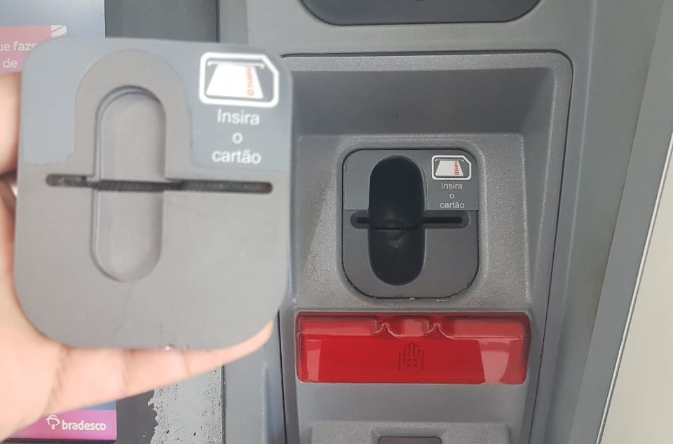 Com as características do suspeito, a equipe da 3ª Cia conseguiu abordá-lo no exato momento que ele fazia uma nova investida. Foram encontradas uma tesoura e em sua carteira diversos papéis com um número falso da instituição financeira, que também estavam colados no terminal. Os policiais notaram que tinha sido inserido um dispositivo que já tinha retido o cartão de um cliente.