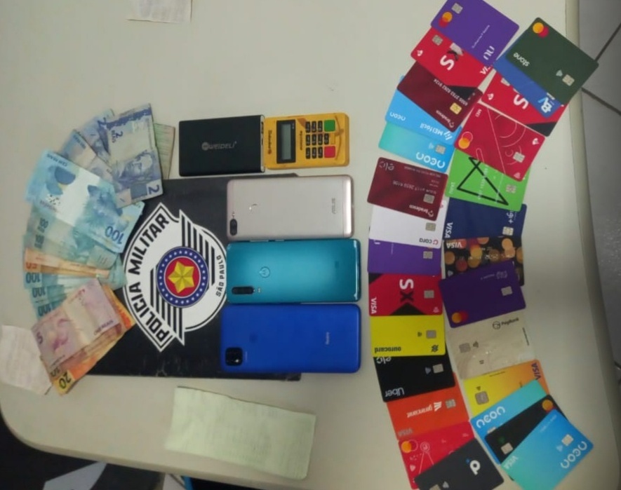 Após as buscas pessoais e veicular com os indivíduos foram localizados diversos comprovantes de transações bancárias via “PIX” bem como inúmeros cartões bancários de diversos bancos e agências, também foi localizado um total de R$945 reais em espécie.