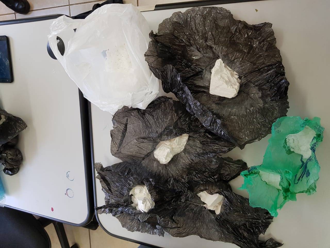 No interior da residência os três indivíduos foram abordados e durante as buscas foram localizadas 3,842kg de cocaína; sendo: 2560 “pinos” cheios, pesando 3,061kg, à granel 0,654kg, “mistura/cafeina 0,415kg, 8000 pinos vazios, um liquidificador, dois pratos sujos de cocaína e uma peneira.