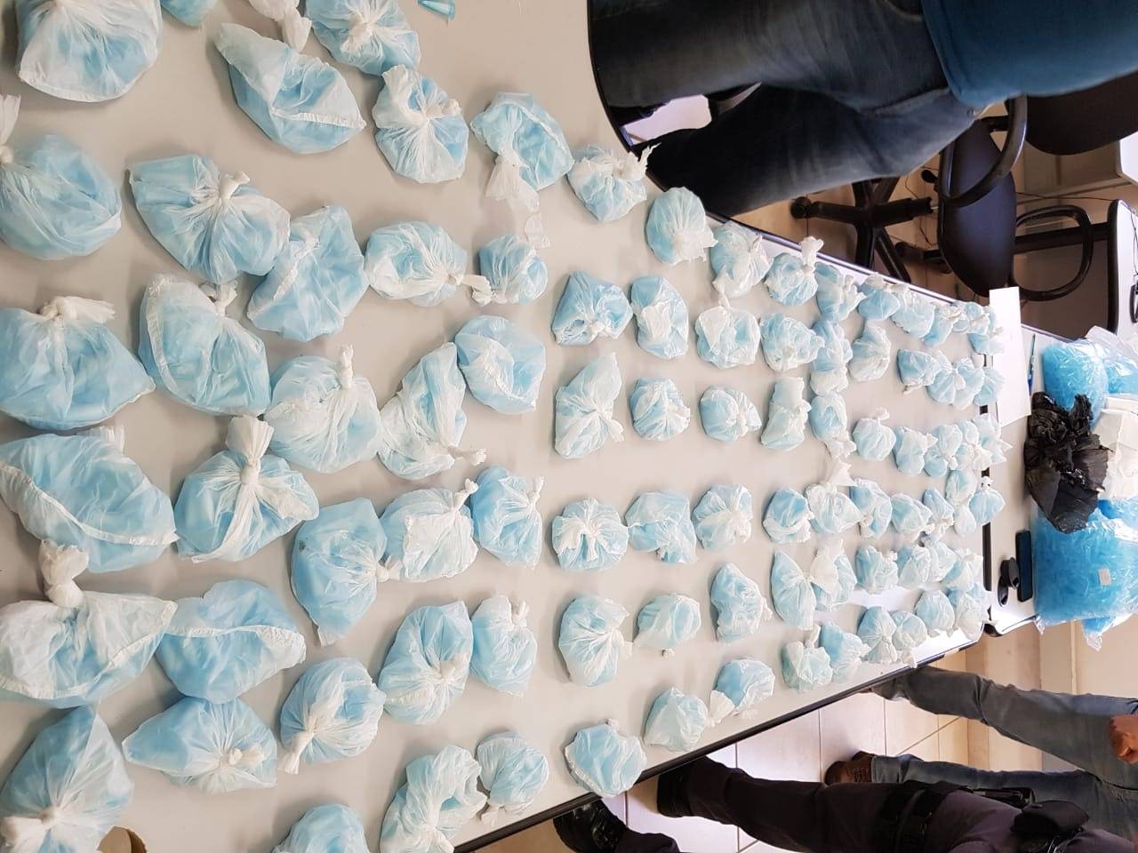 No interior da residência os três indivíduos foram abordados e durante as buscas foram localizadas 3,842kg de cocaína; sendo: 2560 “pinos” cheios, pesando 3,061kg, à granel 0,654kg, “mistura/cafeina 0,415kg, 8000 pinos vazios, um liquidificador, dois pratos sujos de cocaína e uma peneira.