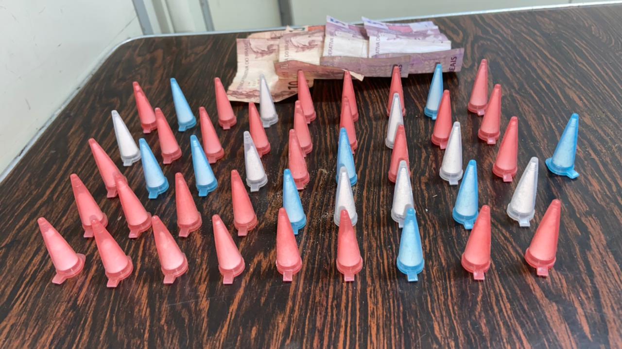 Os indivíduos, ao avistarem a viatura se aproximando, se evadiram, sendo detido apenas um que dispensou dois blocos de cocaína, totalizando 46 pinos. Durante revista pessoal, foi localizada a quantia de R$ 30,00 reais.