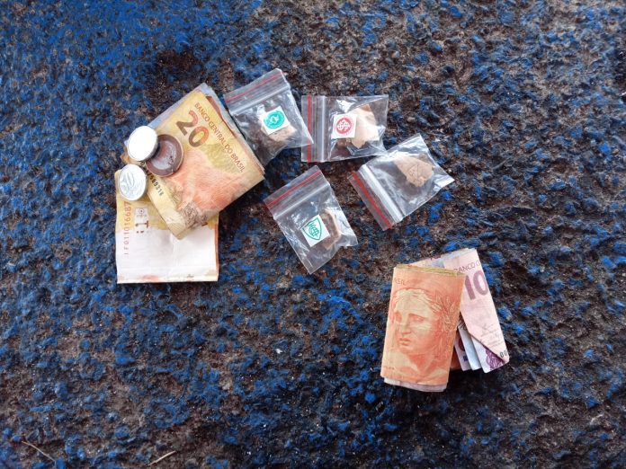 Com apoio de demais equipes, composta pelo sargento Elias, cabo Sidemar, cabo Fontes e soldado Jordano, três pessoas foram abordadas, com elas foram encontradas valores de 58, 35 e 83 reais em dinheiro. No momento da abordagem o menor dispensou um “ziplock”, contendo maconha. Em um monte de entulhos, próximo da abordagem, foram encontrados mais dois “ziplock”, e em uma construção mais um.