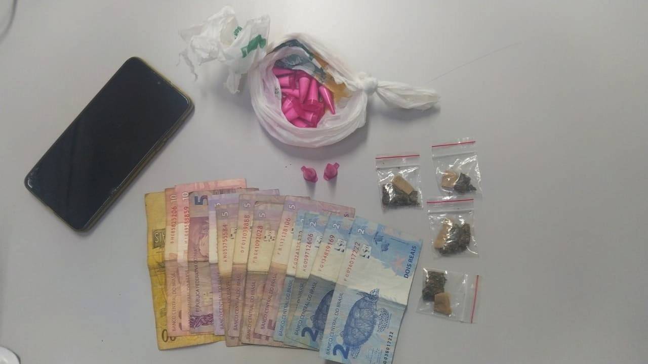 Pelo local, dois indivíduos foram abordados, um deles estava com quatro buchas de maconha e R$ 78,00 reais, e o outro estava com dois pinos de cocaína e R$ 5,00 reais. Em varredura pelo local, foram encontrados em cima de um orelhão público, mais 13 pinos de cocaína.