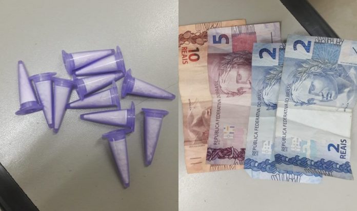 Foi realizado abordagem e em busca pessoal, foram encontrado 02 pinos de cocaína e a quantia de R$ 19,00 em notas trocadas, em seu bolso direito, próximo dele foi localizado em um cano de esgoto uma pochete contendo mais 09 pinos de cocaína.