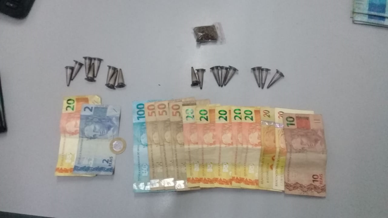 Com outro rapaz que estava ao lado, foram localizados uma pochete contendo mais 8 flaconetes e R$ 22,00. No local, o maior afirmou que estava vendendo e o menor é o gerente do local.