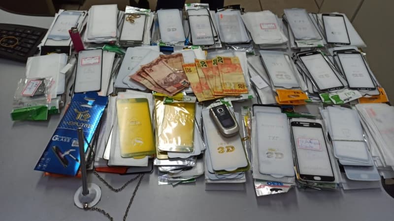 Nas proximidades de onde eles estavam foi encontrada uma caixa de papelão contendo mais de 500 películas para aparelho celular, avaliadas entre R$ 10,00 à R$ 35,00 cada unidade. Indagados sobre o material, os mesmos disseram que não seriam deles, só que alguns populares informaram os policiais militares que os dois estavam de posse dessa caixa.
