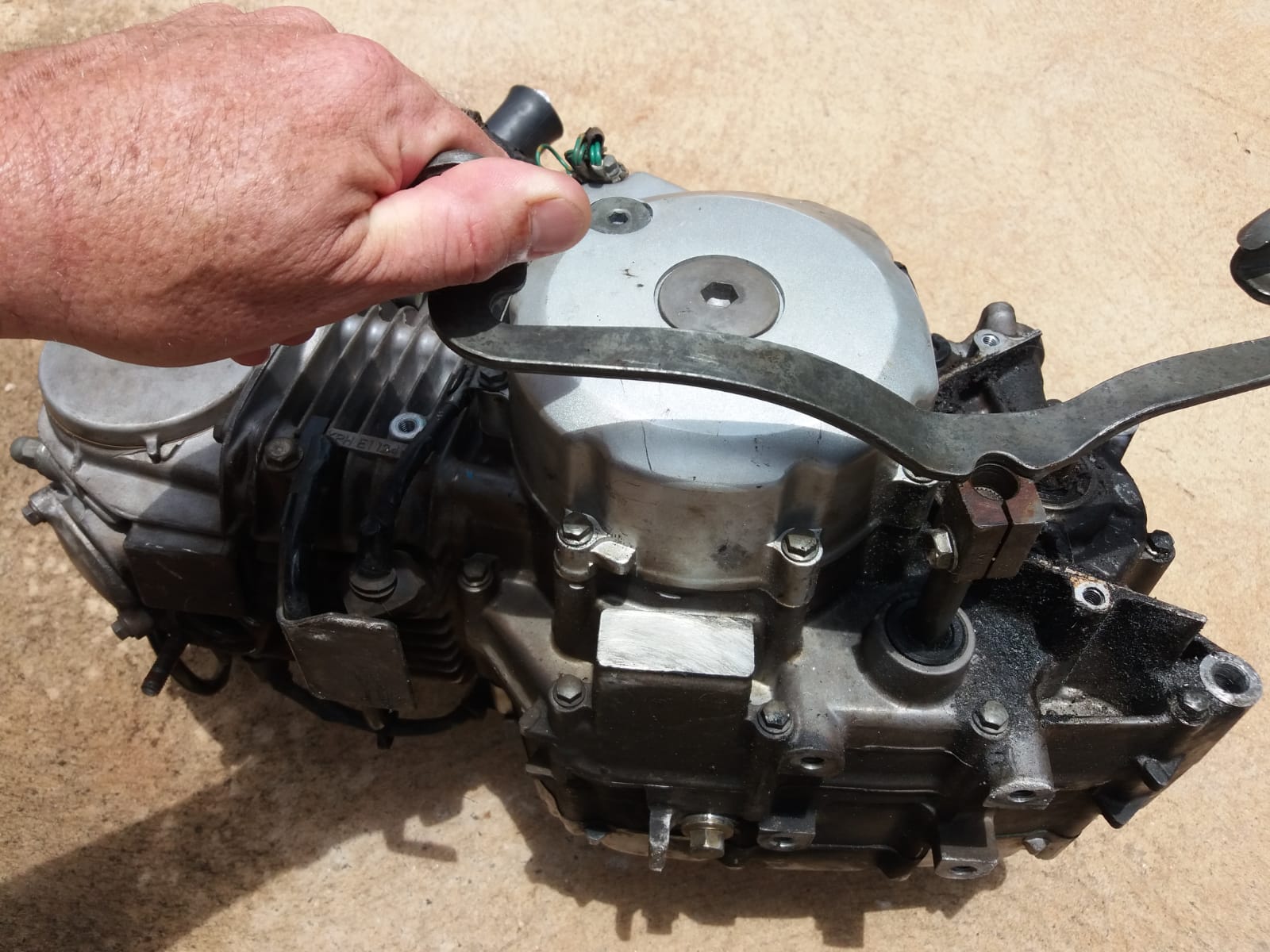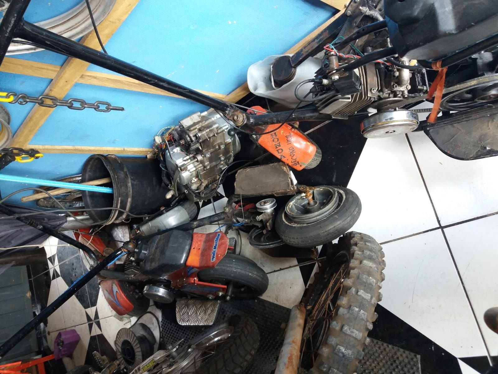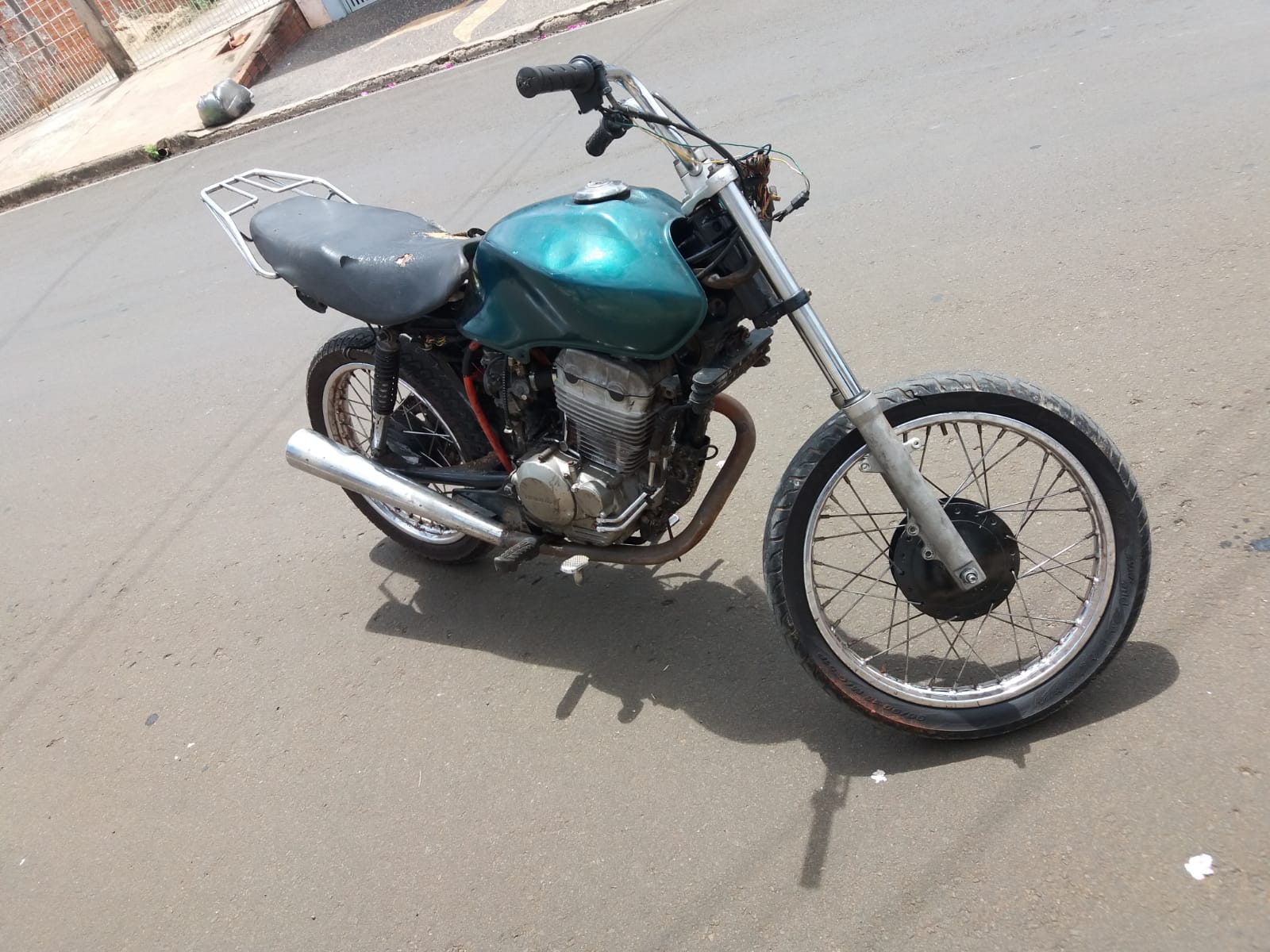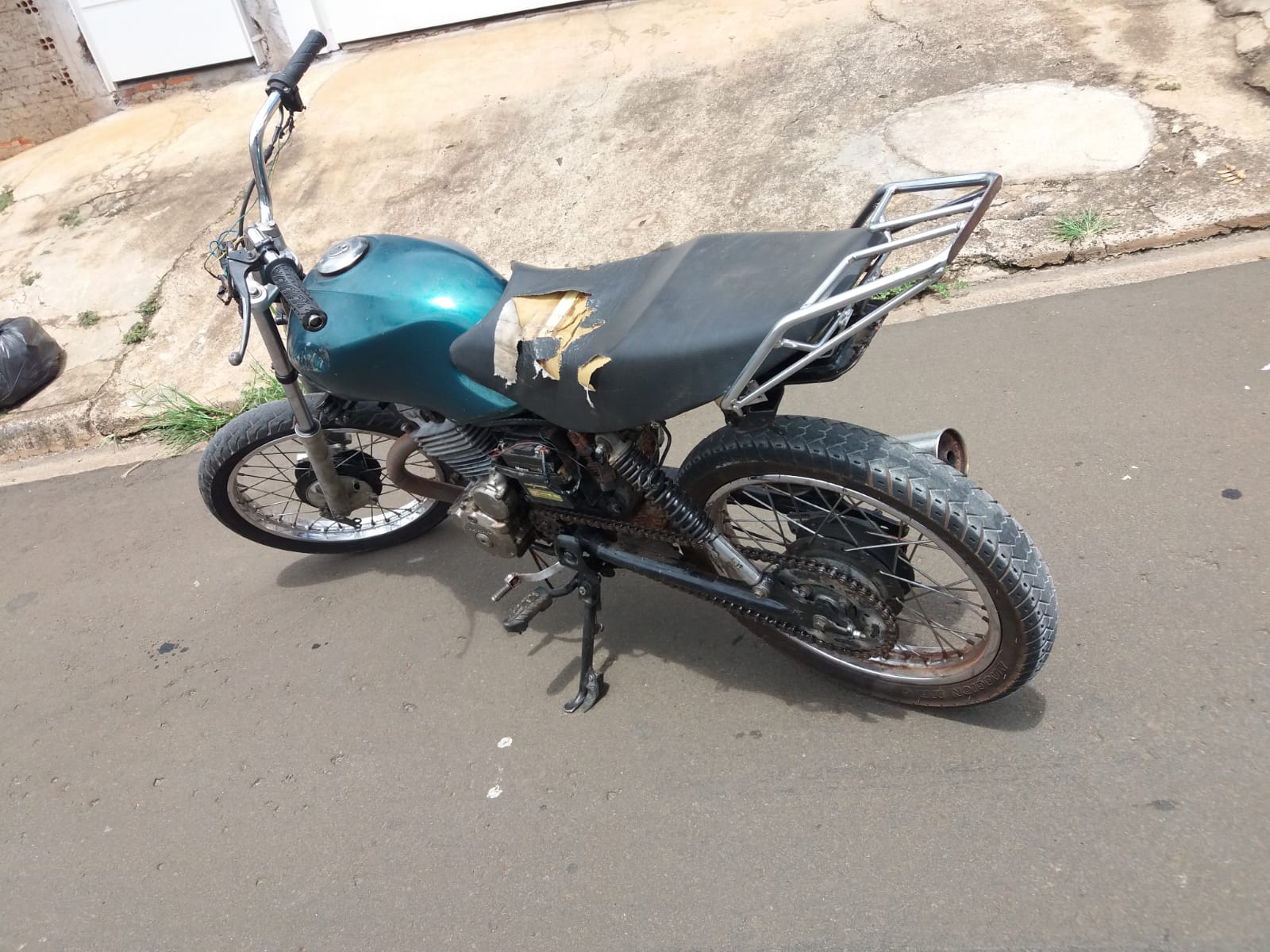 Com apoio dos policiais (sargento Isaías, cabo Moraes, cabo Santana, cabo De Carli, cabo Boldrin e soldado Tiago) da equipe “C”, foi possível averiguar o local, onde foi localizada uma motocicleta Honda/CG na cor verde sem emplacamento, ostentando um motor de Honda/Twister com a numeração adulterada e também um motor de Honda/Biz, com a numeração totalmente suprimida.