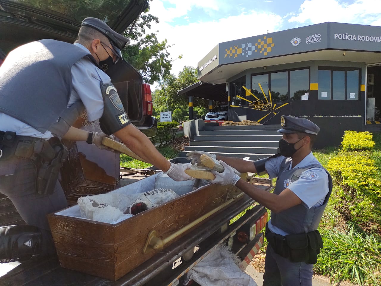 De acordo com a Polícia, a equipe do Tático Ostensivo Rodoviário abordou um guincho que transportava um Volkswagen Santana Quantum de uma funerária. Dentro do automóvel, havia um caixão e um forte odor de maconha. Quando aberto, a equipe encontrou a droga.