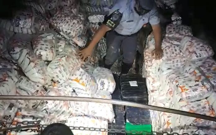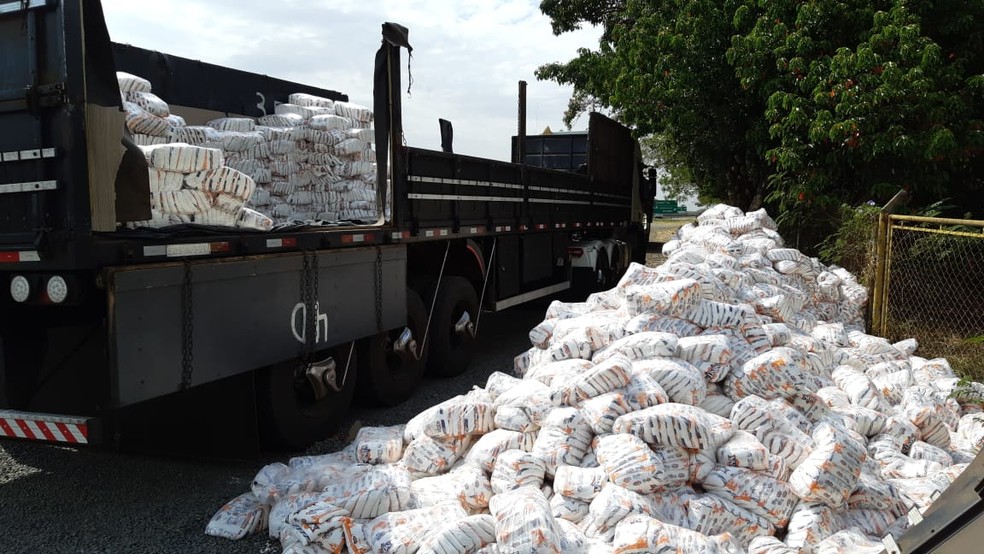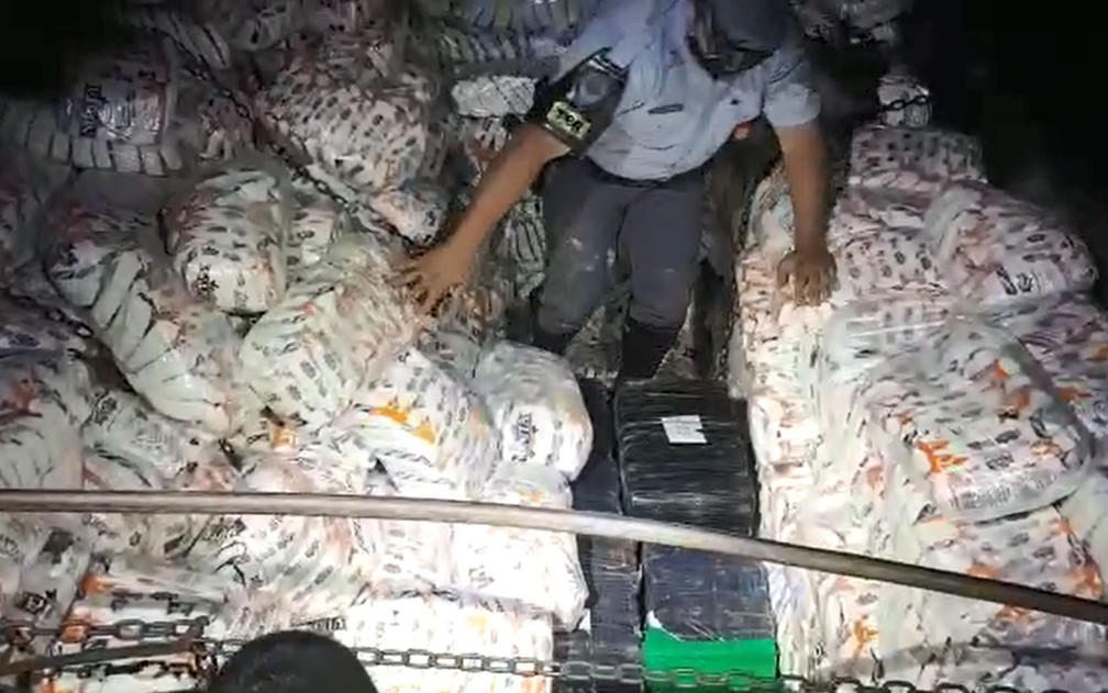 Ao questionarem o caminhoneiro sobre a carga, o mesmo informou que transportava farinha de trigo. Nada suspeito foi localizado na cabine, mas ao retirarem a lona, foi possível sentir o forte odor de maconha.