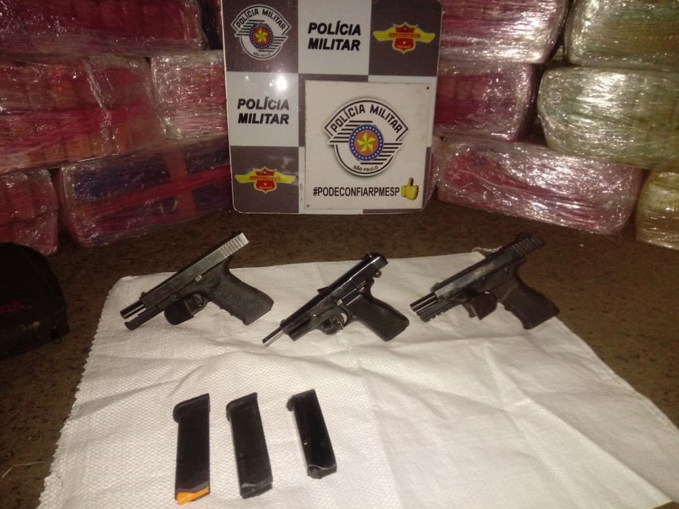 Além da droga, totalizando 6.835 quilos, foi apreendido também três pistolas (duas de calibre 9mm e uma do calibre 380). O motorista do caminhão e da caminhonete foram presos por tráfico de drogas.