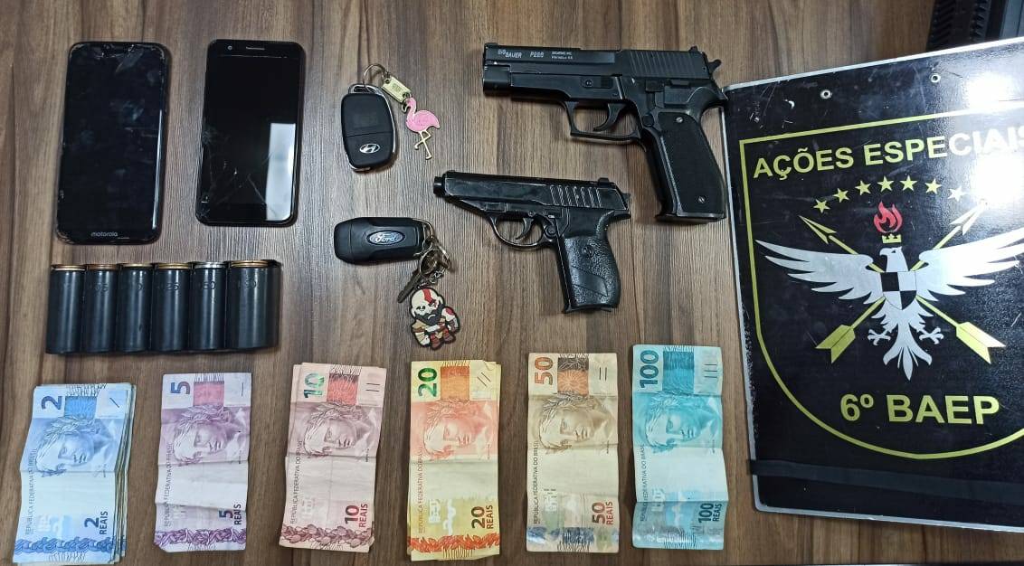 Na busca pessoal foi localizado com dos indivíduos na cintura dois simulacros de arma de fogo do tipo pistola, dois aparelhos celular, uma chave de veículo automotor da marca Hyundai e a quantia de R$ 302,40 em espécie, divididos em cédulas e moedas. Questionado a respeito da procedência do veículo, confessaram que haviam roubado de um motorista de aplicativo minutos antes alí nas imediações.