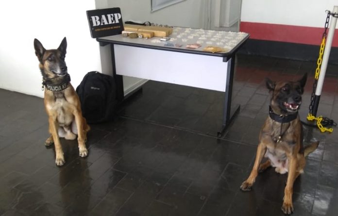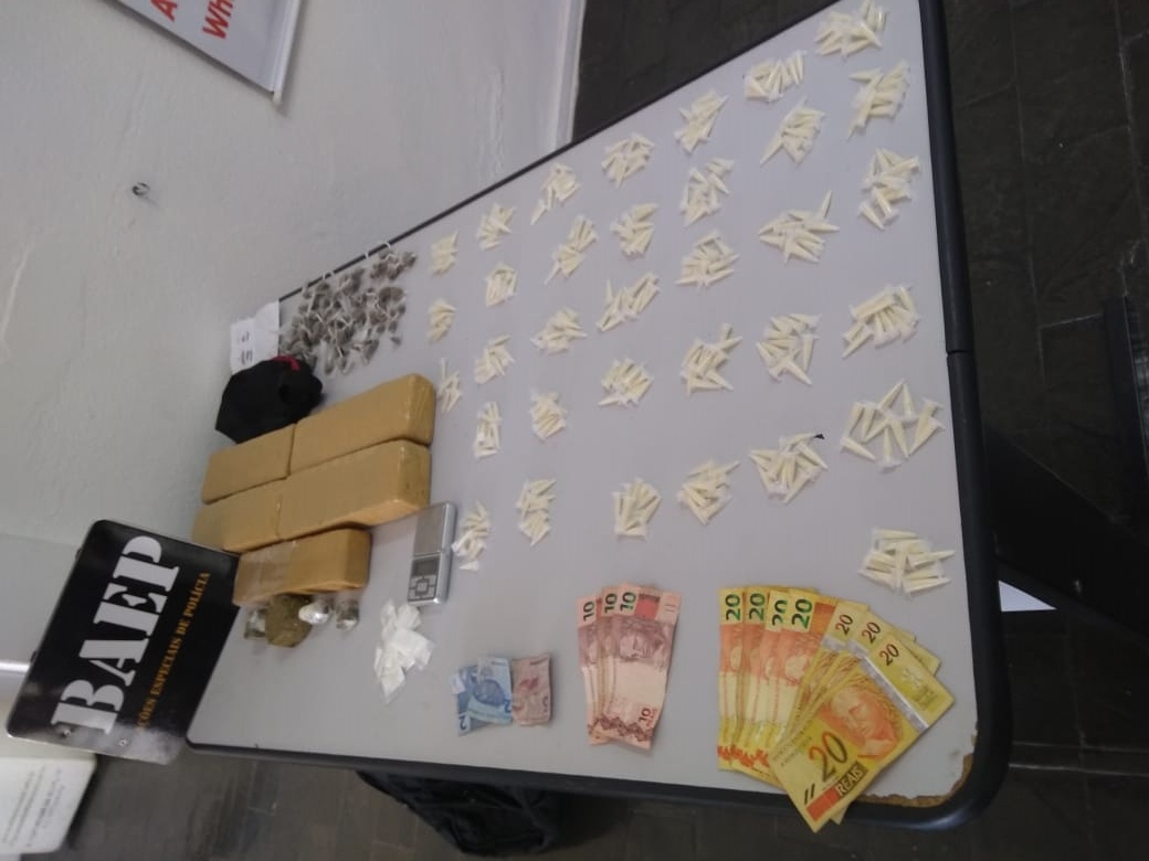 Durante revista pessoal, os policiais encontraram a quantia de R$ 170,00, e ao ser entrevistado afirmou que trabalhava para o tráfico local. Diante dessa afirmação foi utilizado o cão HATCH, que localizou uma mochila na cor preta e, dentro haviam 5 tijolos de maconha, 336 eppendorff de cocaína, 16 papelotes de cocaína, 88 trouxinhas de maconha, 01 trouxinha de haxixe, 01 balança de precisão.