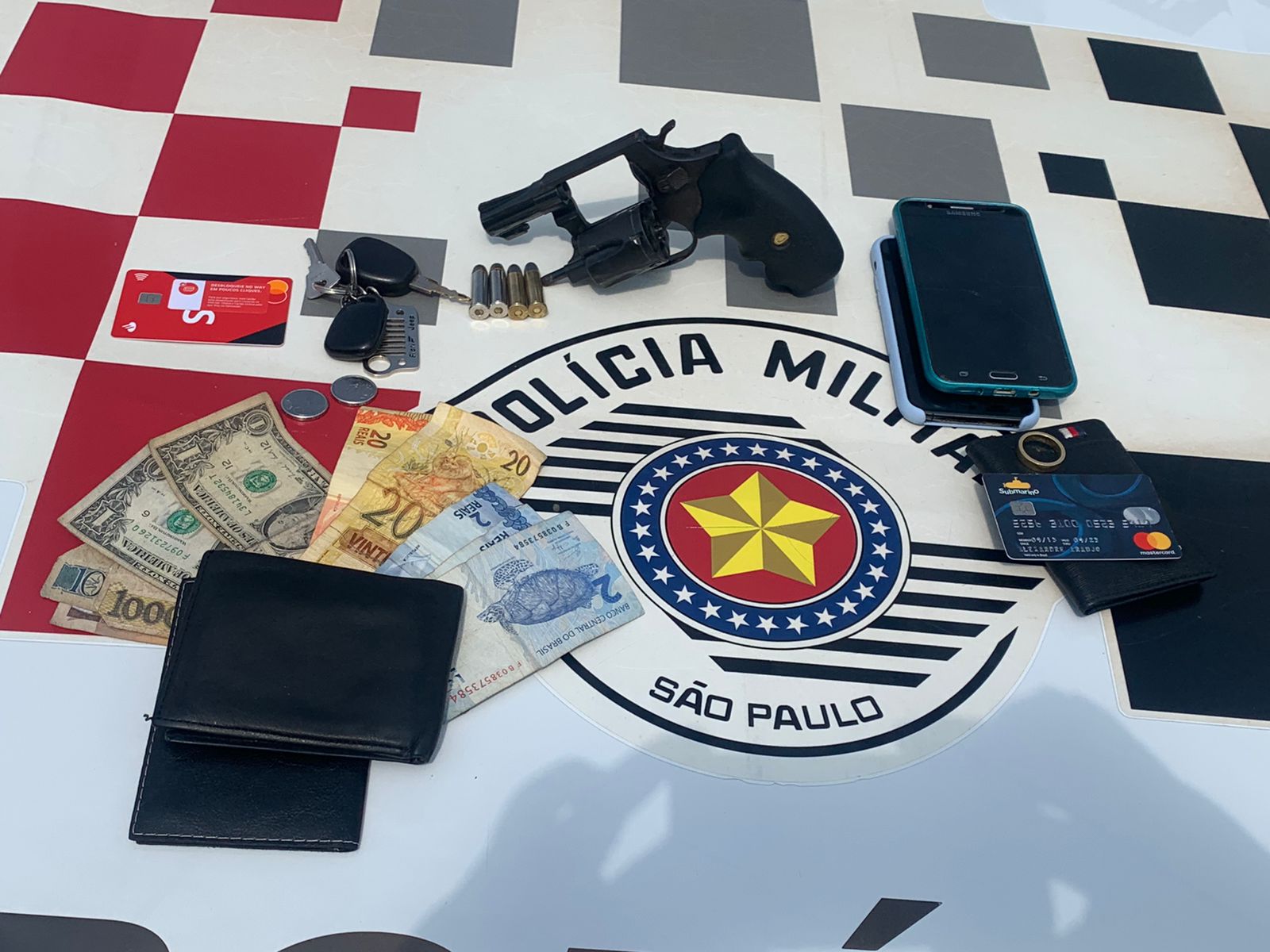 Com eles um revólver cal .38 numeração raspada, dinheiro, cartões e pertences da vítima. A ocorrência foi apresentada no 3º Distrito Policial, onde após serem ouvidos pela autoridade presente, permanaceram à disposição da Justiça.