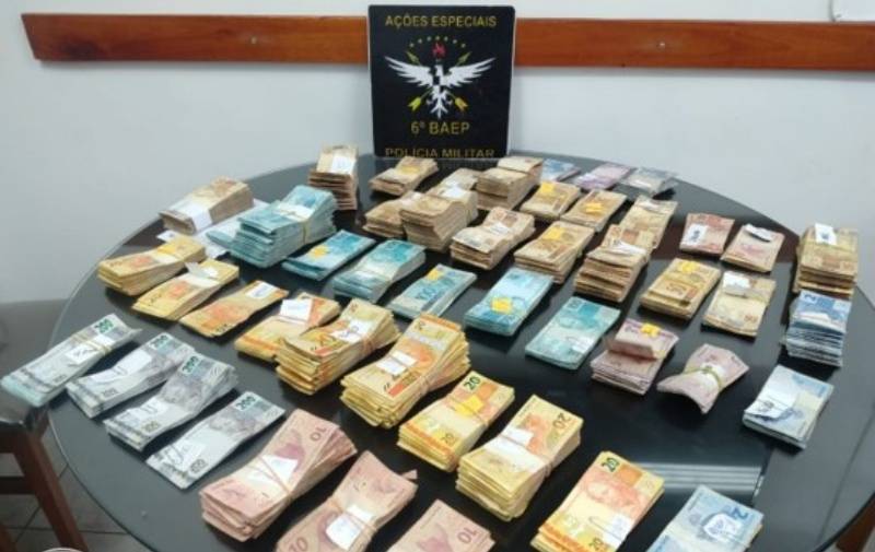 Na busca pessoal nada de ilícito foi encontrado, porém próximo a ele estava uma mochila contendo R$229.214,00 (duzentos e vinte e nove mil duzentos e quatorze reais) e um revólver Taurus calibre 38 com 05 munições. O abordado confessou ter passagem pelo sistema prisional por roubo e informou o local onde estaria o 2º membro da quadrilha.