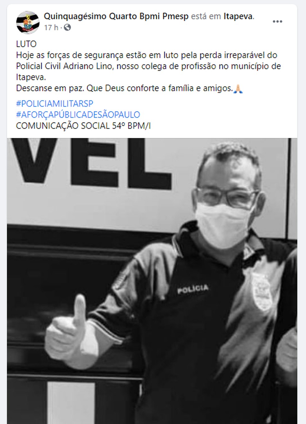 Nas redes sociais, a Polícia Militar também publicou uma homenagem ao policial: “Hoje as forças de segurança estão em luto pela perda irreparável do policial civil Adriano Lino, nosso colega de profissão.”