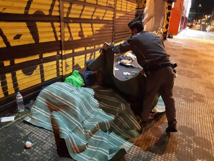 Na madrugada da última terça-feira (1º), enquanto os termômetros marcavam 12ºC, os policiais militares do Comando de Policiamento de Área Metropolitana 3 (CPA/M-3) realizaram uma ação solidária e distribuíram mais de 100 cobertores para pessoas em situação de rua, na região dos bairros Tietê, Carandiru e Santana, ambos na zona norte da Capital.
