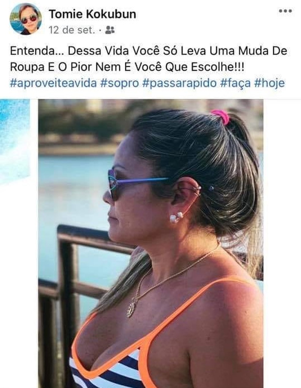 “Entenda… Dessa vida você só leva uma muda de roupa, e o pior, nem é você quem escolhe! #aproveiteavida #sopro #passarapido #faça #hoje”, diz a postagem feita em sua conta no Facebook.