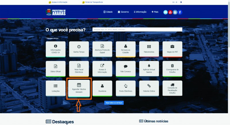 Já está disponível no site da Prefeitura Municipal de Araras – www.araras.sp.gov.br – o agendamento para dose de reforço da vacina contra a Covid-19, Janssen. Os cadastros devem ser realizados no ícone “AGENDAR VACINA JANSSEN”, presente na área “Principais Serviços” (parte superior) do site.