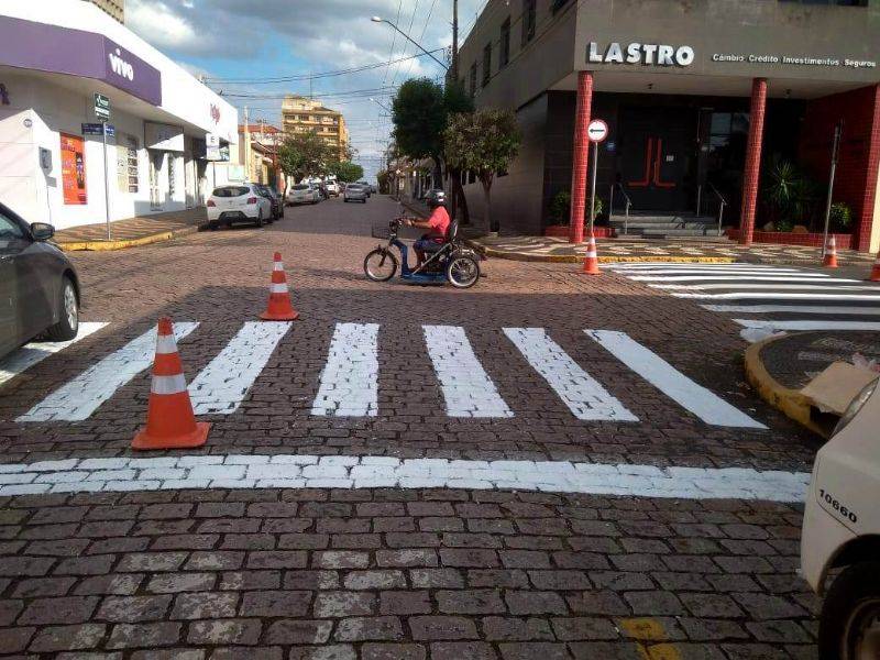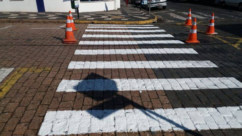 Faixas de travessia de pedestres e de estacionamento para idosos do Centro da cidade estão recebendo reforço na pintura desde a manhã da última sexta-feira (10) por equipes do Demutran (Departamento Municipal de Trânsito).