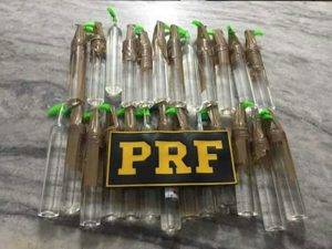 Durante vistoria no interior do veículo foi localizado em poder de um passageiro, um adolescente de 17 anos, uma sacola contendo 25 tubos de lança-perfume.