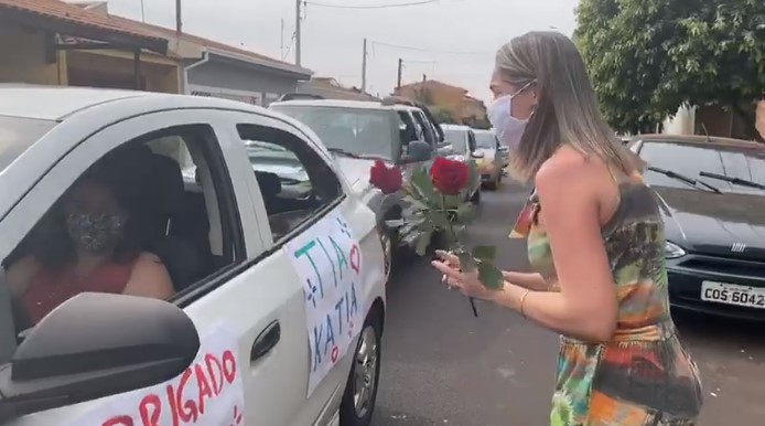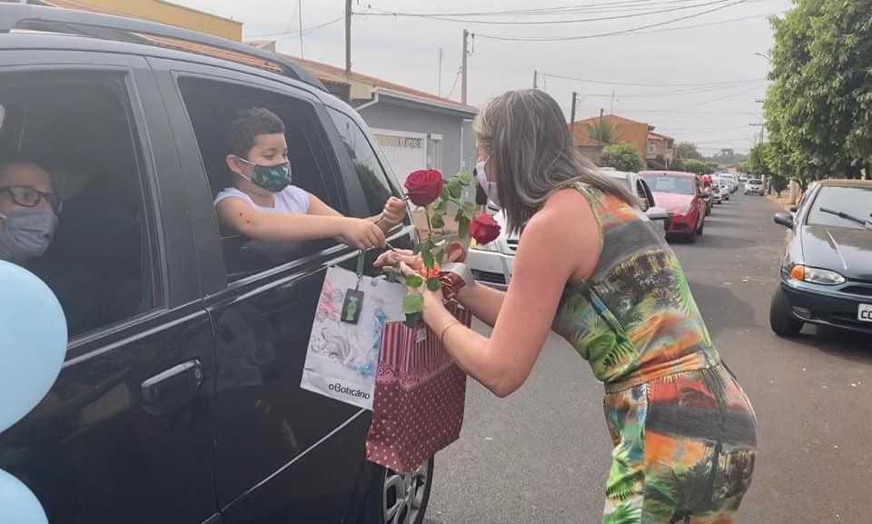 ?Flores, presentes e um carro de som emocionaram a professora e quem assistia a cena. Os alunos e seus pais decidiram agradecer pelo empenho da professora no processo de alfabetização das crianças que foi um sucesso mesmo com a novidade do ensino não presencial.