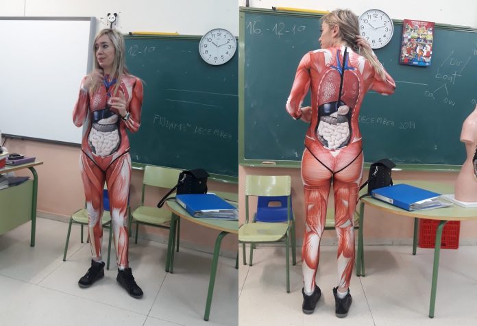 Uma professora de crianças com 8 e 9 anos ganhou as redes sociais por sua inovação na forma de ensinar Ciências: se vestiu de “corpo humano”, com uma fantasia que mostra a posição dos órgãos internos e dos músculos.