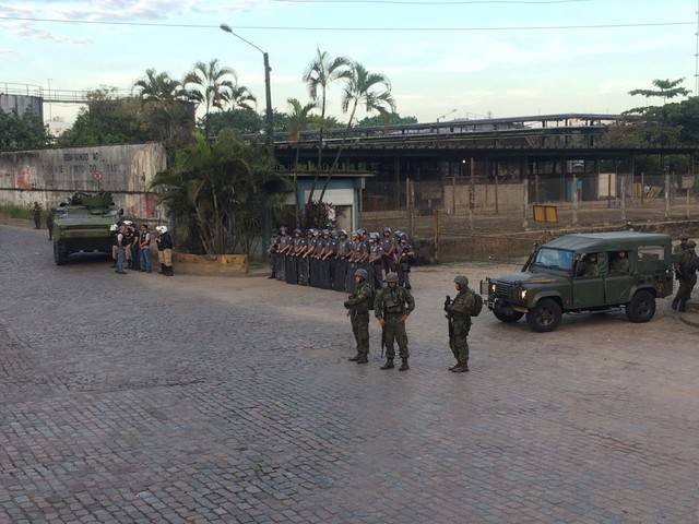 Militares do Exército, soldados do Baep e a Marinha do Brasil chegaram ao local para garantir a segurança de entrada e saída de caminhões do Porto.