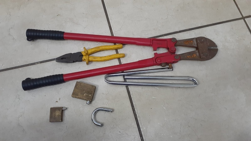 No momento da abordagem o indivíduo estava com uma barra de ferro nas mãos, ao seu lado, sobre o suporte da bicicleta estava um alicate (corta a frio), já no chão, em uma bolsa, foi localizado um alicate comum e os dois cadeados danificados do trailer.
